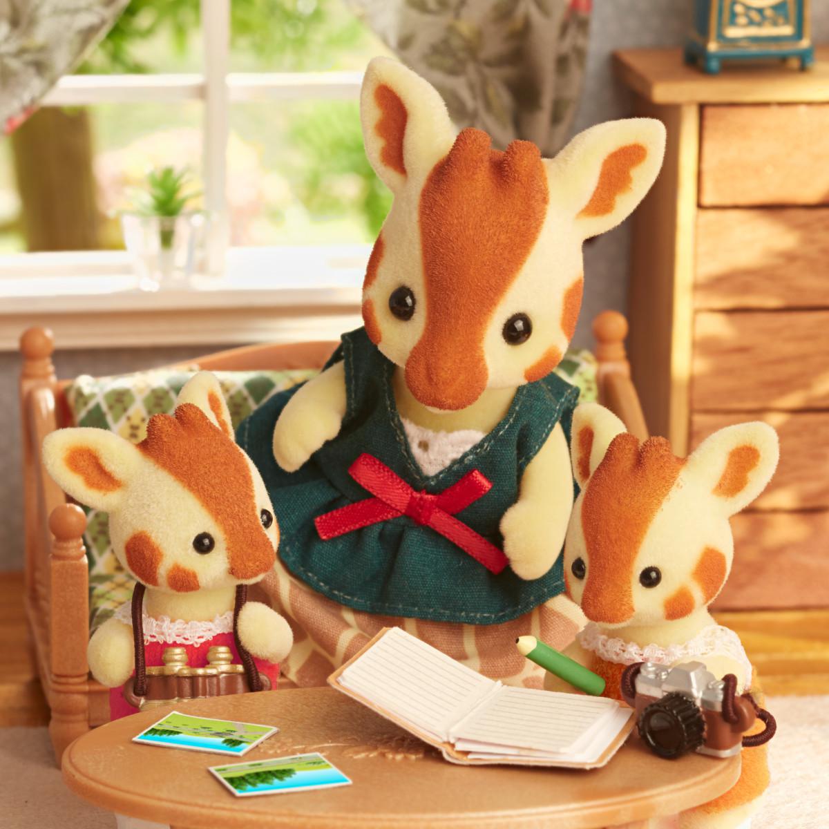Mother, Olive is calm and gentle. She loves cream puffs full of custard, because the custard is yellow like her! Cream puffs are her special snack and she doesn't like to share them, so she keeps them up high where the children can't see them and eats them when the children aren't looking. But the children always see the custard around her mouth and say "Can we have some?". Father, Egbert is a calm, gentle soul. He often forgets how tall he is and bumps his head on things. He likes old things and takes good care of them—he has lots and lots of vintage tools. Baby Sister, Brie loves to look into the distance with the binoculars her father gave her. She loves to sit all the way up on her mother's head so that she can see even further. When her brother, who's a year older than her, takes photos, she puts them in a diary and writes about them. Baby Brother, Bran loves to take photos with the camera his father gave him. He wants to grow up big and tall like his father, so that he can see far off in the distance and take wonderful photos from up high.